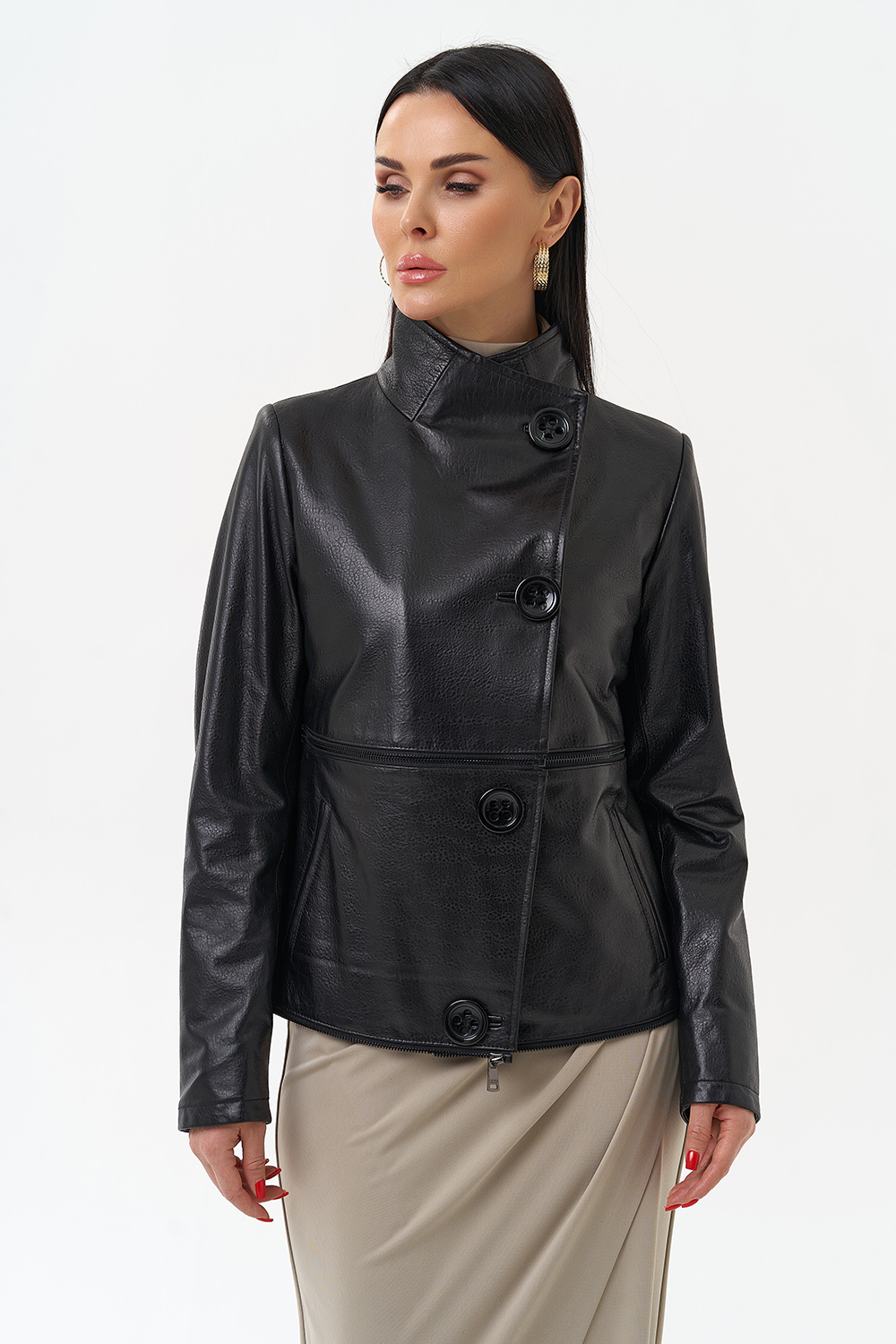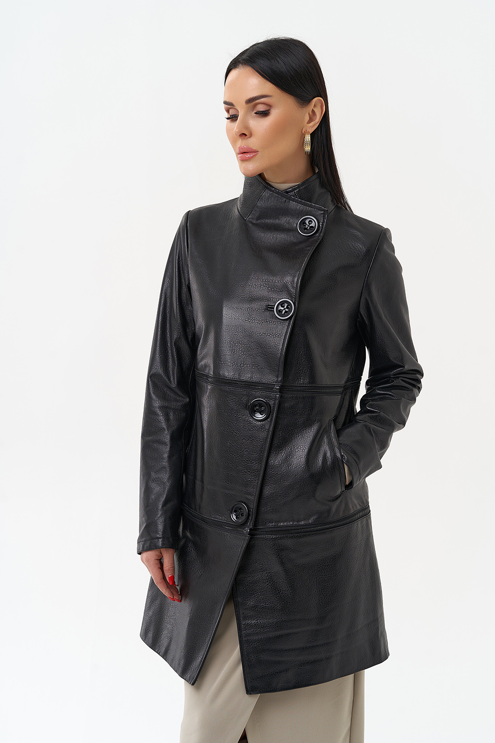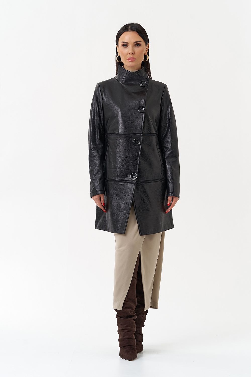 Данная модель выполнена из высококачественной мягкой матовой кожи. Прямой силуэт обеспечивает идеальную посадку по фигуре. Изюминкой данной модели являются две горизонтально вшитые металлические молнии, которые при небольшом усилии трансформируют данную модель в три самостоятельных изделия длиной (кожаный френч 80 см, Кожаная куртка 55 см и кожаное болеро 30см). Данная модель очень универсальна, подойдёт обладательницам любого возраста и стиля.