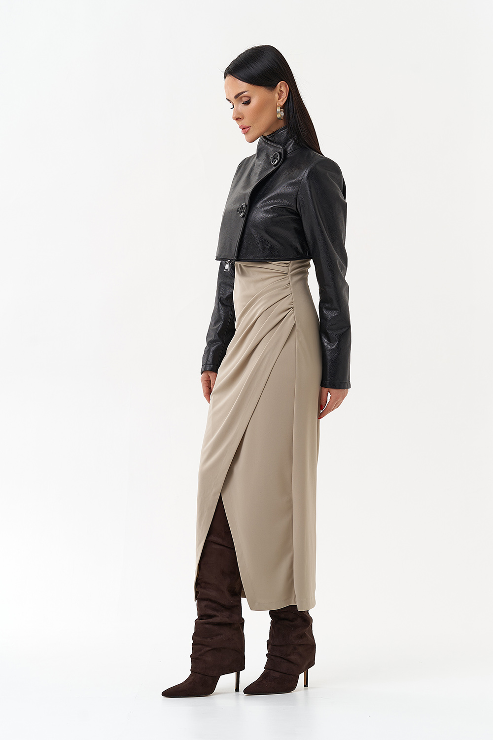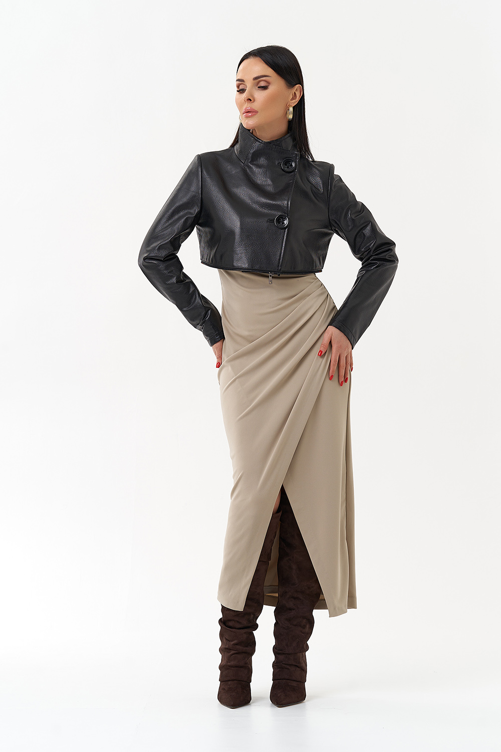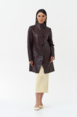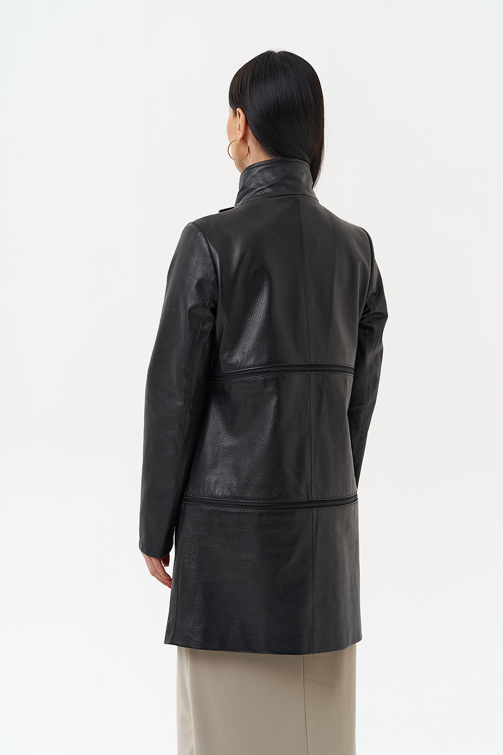 Данная модель выполнена из высококачественной мягкой матовой кожи. Прямой силуэт обеспечивает идеальную посадку по фигуре. Изюминкой данной модели являются две горизонтально вшитые металлические молнии, которые при небольшом усилии трансформируют данную модель в три самостоятельных изделия длиной (кожаный френч 80 см, Кожаная куртка 55 см и кожаное болеро 30см). Данная модель очень универсальна, подойдёт обладательницам любого возраста и стиля.