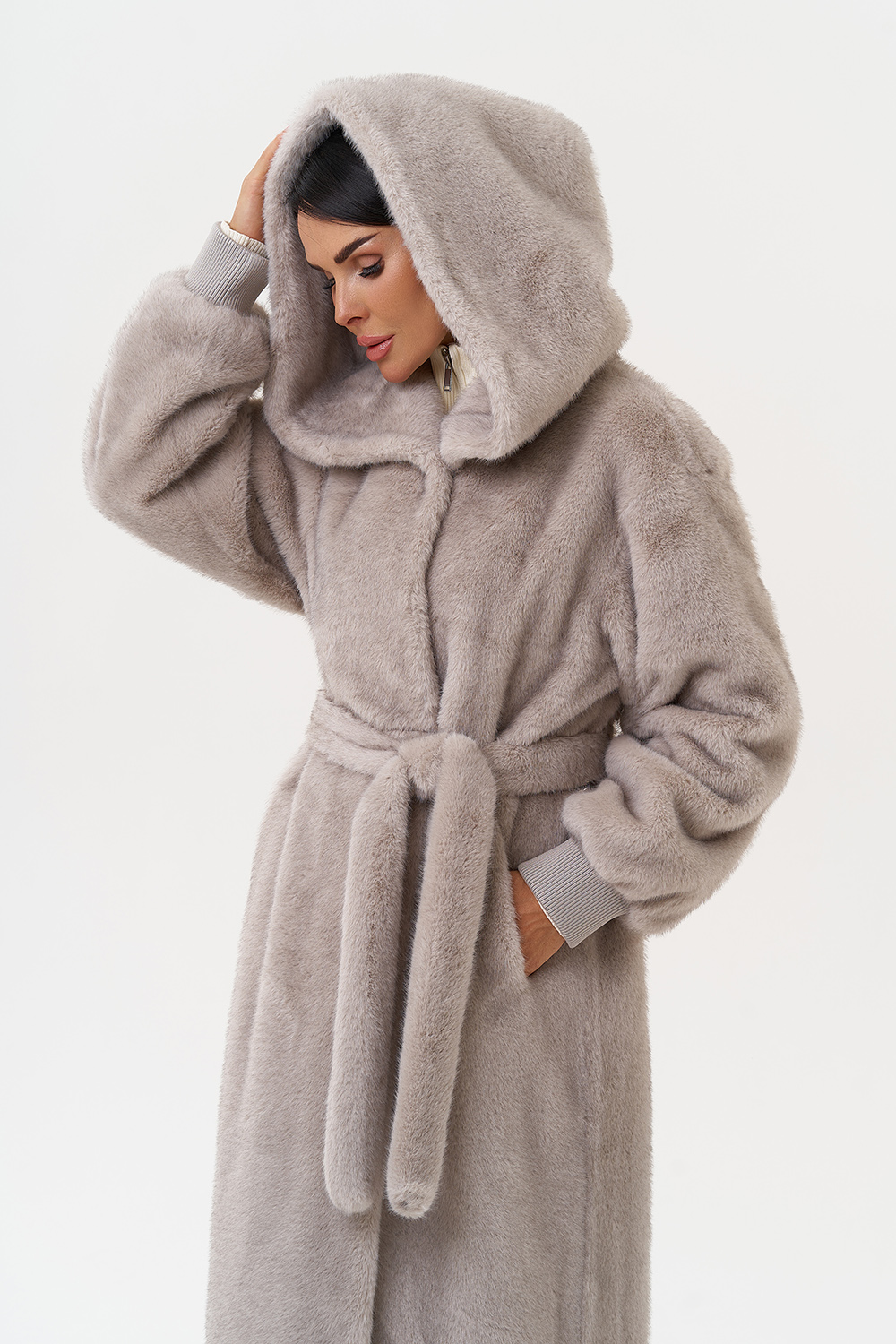 Фасон - прямой Длина изделия - 120 см Цвет - серый Материал - экомех Состав полотна - полиэстер 100% Подкладка - полиэстер 100% Вид застежки - молния, пояс, кулиска на талии Вид ворота - капюшон Фасон рукава - спущенное плечо, длинный |